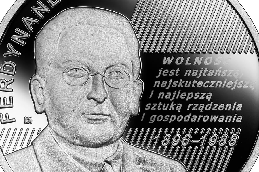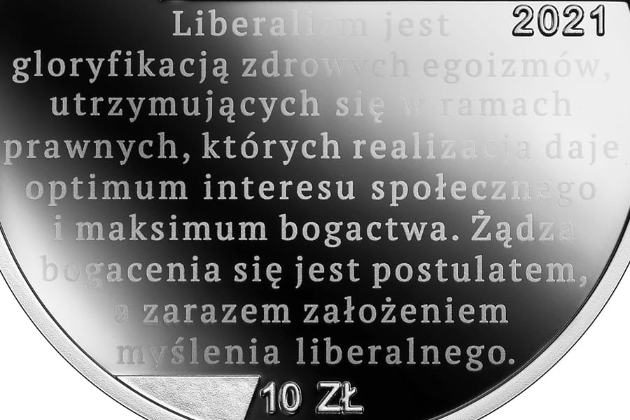 Awers: u góry, na wyodrębnionej płaszczyźnie wizerunek orła ustalony dla godła Rzeczypospolitej Polskiej, pod orłem, po prawej stronie znak mennicy: m / w; poniżej orła napis: RZECZPOSPOLITA POLSKA, pod nim, z prawej strony oznaczenie roku emisji: 2021. Centralnie fragment dzieła Ferdynanda Zweiga „Cztery systemy ekonomii. Uniwersalizm – nacjonalizm – liberalizm – socjalizm” o treści: Liberalizm jest / gloryfikacją zdrowych egoizmów, / utrzymujących się w ramach / prawnych, których realizacja daje / optimum interesu społecznego / i maksimum bogactwa. Żądza / bogacenia się jest postulatem, / a zarazem założeniem / myślenia liberalnego - zakończony kropką. U dołu, z lewej strony wyodrębniona płaszczyzna, z jej prawej strony napis: 10 ZŁ.