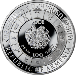 Awers: W centralnej części herb Republiki Armenii. Powyżej herbu rok emisji, poniżej nominał monety, 100 Dram, w języku armeńskim. Herb otoczony dwunastoma symbolami ilustrującymi każdy ze znaków zodiaku. Na obrzeżu, w górnej części monety półokrągły napis Republika Armenii w języku armeńskim, u dołu nazwa emitenta w języku angielskim.