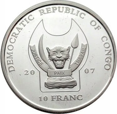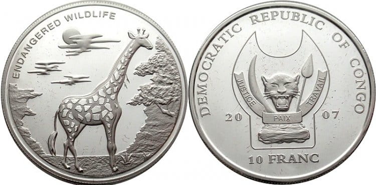 Demokratyczna Republika Konga: moneta kolekcjonerska 10 franków / 2007 r. - Zagrożone zwierzęta - Żyrafa.
