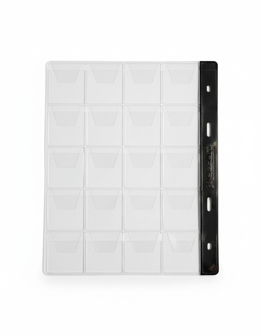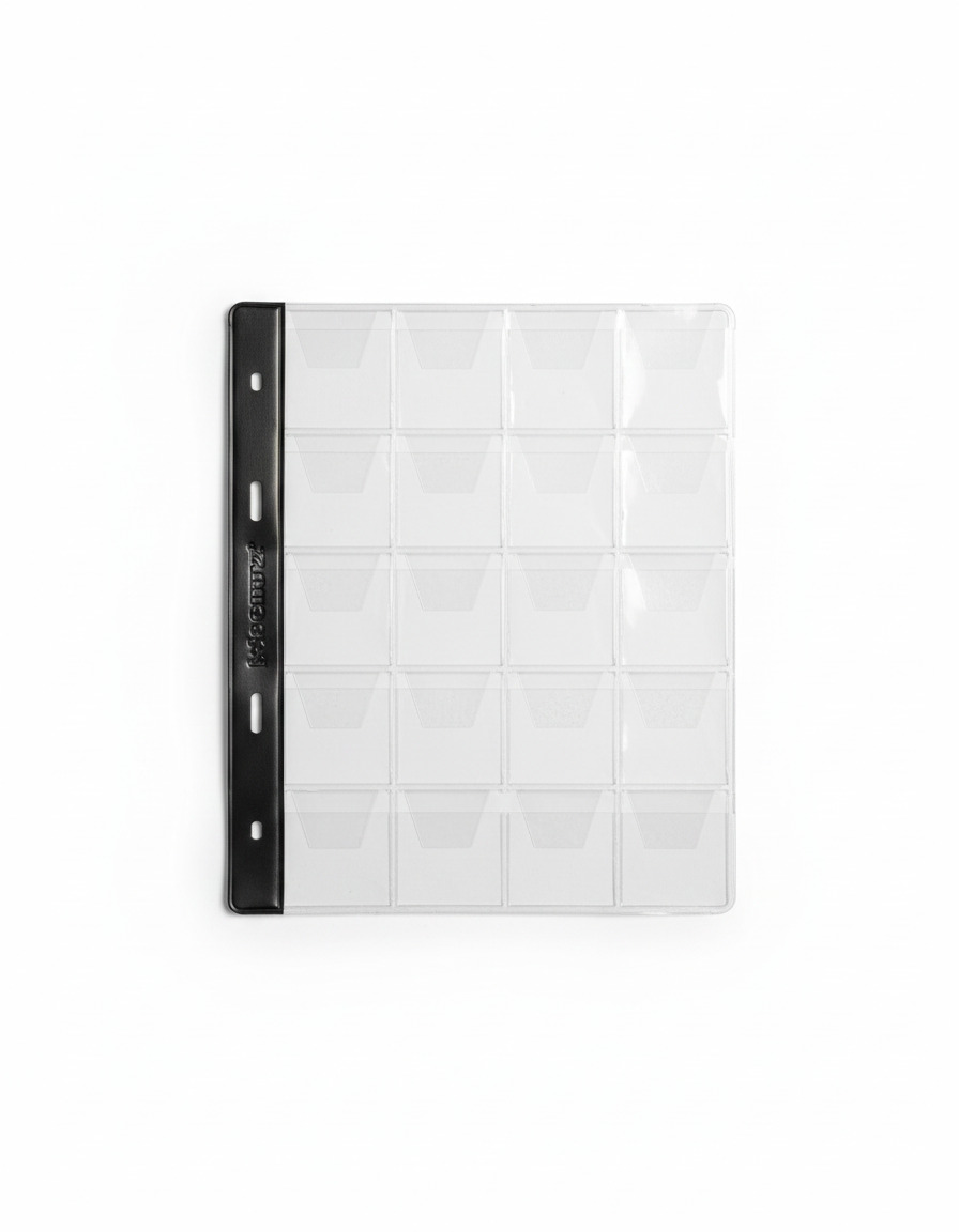 Strona do klasera na monety typu ''20'' posiada 20 okienek / kieszonek o wielkości 35 x 40 mm z zabezpieczającymi klapkami przed wypadaniem monet.