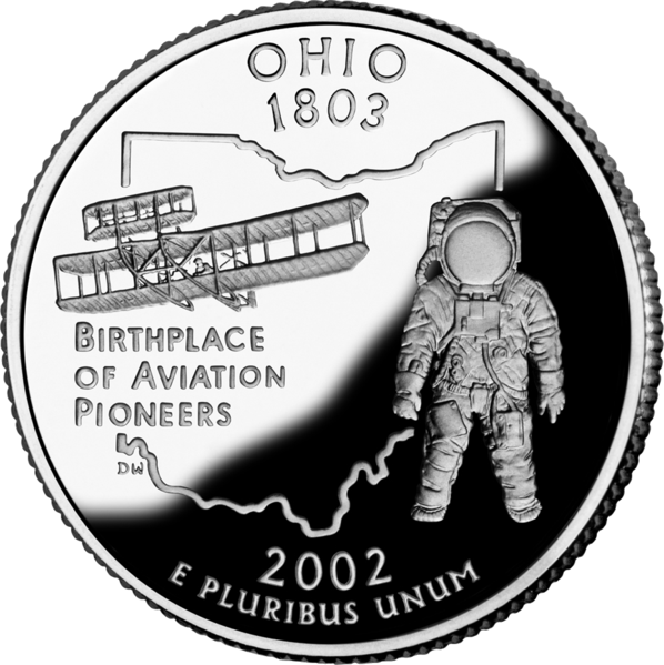 Rewers: Lot Flyer I, kosmonauta (Neil Armstrong, ur. w Wapakoneta), zarys stanu. Napis: „Birthplace of Aviation Pioneers”.