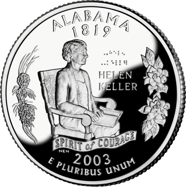 Rewers: Siedząca Helen Keller, gałązka sosny długoigielnej (drzewo stanowe), kwiat magnolii. Wstęga z napisem: „Spirit of Courage” oraz napisy „Helen Keller” (drukowany i Braillem).